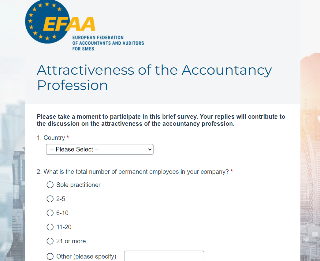 Vous le savez, l’attractivité de la profession reste un défi majeur dans le monde de la comptabilité et de l’audit et les plus petits cabinets ont particulièrement de mal à trouver les profils qu'ils recherchent. Afin d’alimenter les discussions à ce sujet et de trouver des solutions, l’EFAA (European Federation of Accountants and Auditors for SMEs) souhaite entendre ce que vous avez à dire !