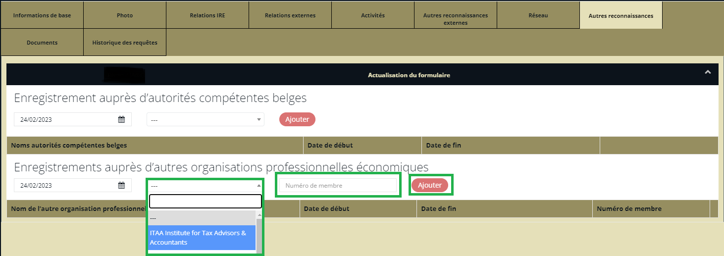 Pour indiquer le numéro de membre que vous avez obtenu auprès d’une autre organisation professionnelle économique, rendez-vous sur le portail IRE et cliquez sur l'onglet « autres reconnaissances » :