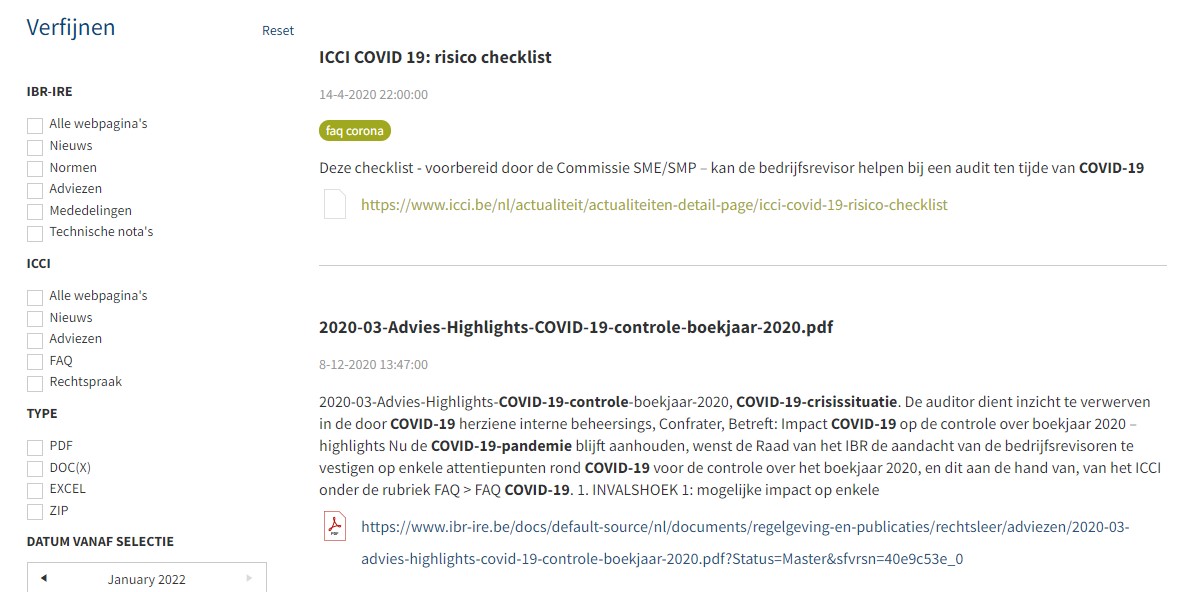 Aan de hand van filters aan de linkerkant van de resultatenlijst kan de zoekactie naar eigen wens worden verfijnd. De resultaten worden via een duidelijk kleurverschil (blauw voor IBR en groen voor ICCI) van elkaar onderscheiden.