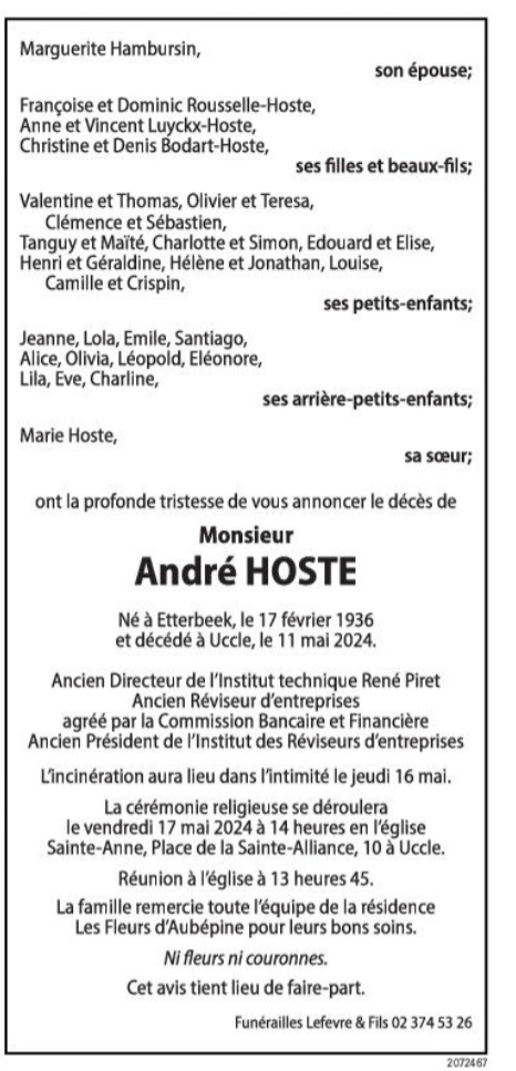 We vernemen met droefheid het overlijden van de heer André Hoste (°Etterbeek, 17 februari 1936 en overleden te Ukkel op 11 mei 2024). De heer Hoste legde de eed als bedrijfsrevisor af op 13 juni 1972.